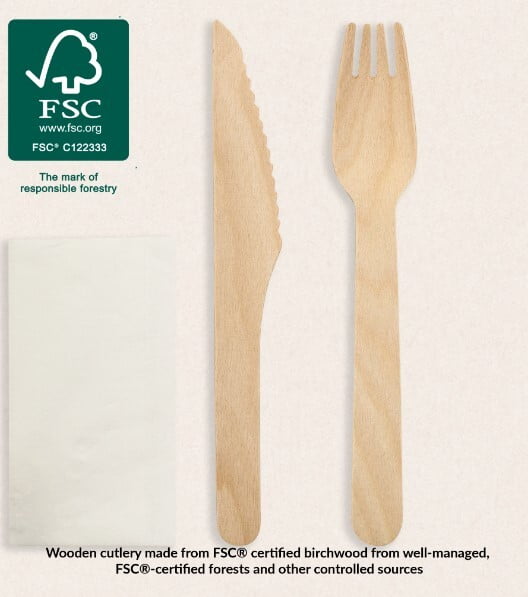 Features and Benefits Put your company’s sustainable values on show with this wooden cutlery range that is both recyclable and home compostable. Build your brand responsibly by reducing your company’s reliance on cutlery made from non-renewable plastics Choose knife, fork and napkins sets, suitable for catering and takeaway businesses Use with your hot, savoury, sweet or greasy dishes Made from FSC® certified birchwood from well-managed, FSC®-certified forests and other controlled sources