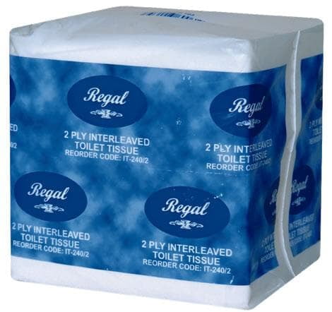 REGAL IT240/2 INTERLEAVED TOILET TISSUE 2-PLY GECA APPROVED Single sheet dispensing improves hygiene and eliminates roll wastage. Superior quality for your comfort Environmentally friendly Dimensions: 10cm x 21cm Ply: 2 36pkts of 240 sheets