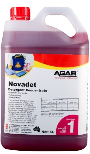 What is Novadet? A concentrated detergent for rapid removal of dirt and spillages from polished floors and all other hard surfaces. Key Benefits Aggressive on dirt Cleans fast & completely Low-alkaline & biodegradable This highly active cleaner with deodorant action suspends dirt and soil so it won’t redeposit onto floor, does not need rinsing from floors, and will not harm alkali-sensitive finishes. For Use On… NOVADET will remove all dirt and spillages including foodstuffs, drinks and cooking oils and general traffic dirt from floors and walls. NOVADET will clean waxed and polished floors, walls, glass, terrazzo, marble, slate and other surfaces needing a low-alkaline cleaner. Use by mop, sponge or autoscrubber. NOVADET is an excellent scrub-back detergent for polished floors when used at stronger concentrations.