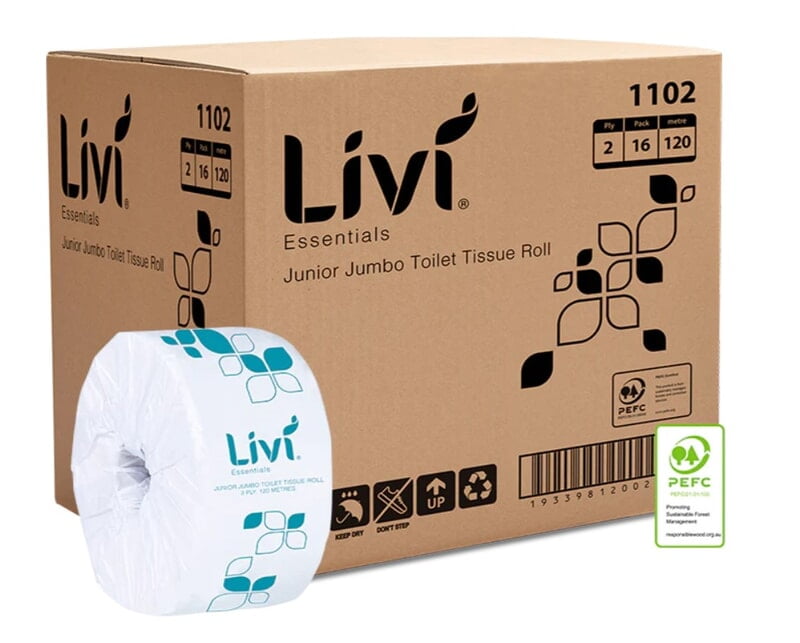 Toilet Paper - Livi - Junior Jumbo Rolls A FRESH ADDITION TO YOUR MODERN BATHROOM 2ply 120m Length x 85mm Width 16 Rolls per Carton Strong, absorbent & long lasting Jumbo sized for space saving
