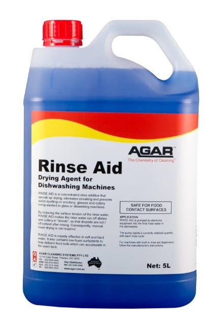 Rinse Aid How Does It Work? RINSE AID is a concentrated rinse additive that speeds up drying and improves the cleanliness of washed crockery, glasses and cutlery by eliminating streaking and preventing water spotting. By reducing the surface tension of the hot rinse water, RINSE AID makes the rinse water run off dishes and cutlery in even “sheets”, so that droplets are not left behind to cause spots or slow down the drying stage. Manual towel drying is unnecessary when RINSE AID is used. RINSE AID is equally effective in soft and hard water.