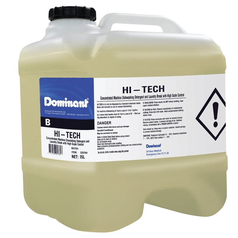 Hi-Tech contains high levels of descaling compounds to maintain the machine in scale free condition in any water. Features Contains high levels of water softening agents and scale inhibitors No need to use an additional descaler Heavy duty cleaner that removes stubborn soiling with ease Highly concentrated giving outstanding economy Phosphate free Non-foaming Can also be used as a laundry break and a CIP (Clean-In-Place) cleaner