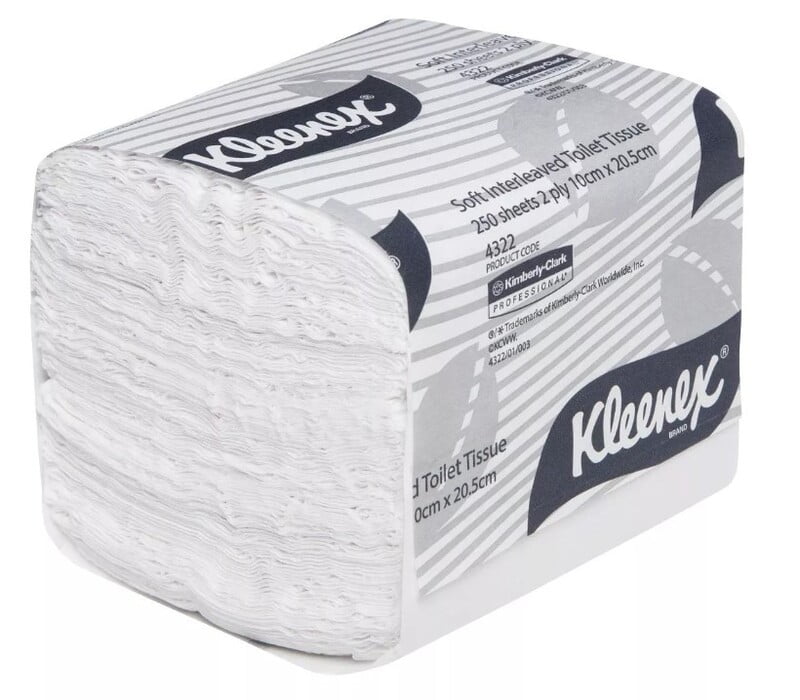 Kleenex® 4322 Soft Interleaved Toilet Tissue 2 ply 36 packs x 250 sheets As well as being soft and absorbent, Kleenex® soft interleaved toilet tissues are dispensed one-at-at-time ensuring the user only touches the paper they use promoting good hygiene in the workplace. Kleenex® Soft Interleaved Toilet Tissue is compatible with multiple dispensers meaning there is a size and finish to match any washroom. Sheet Size: 20.5 x 10cm (unfolded) Size: Pack of 250 sheets Qty: Carton of 36 packs