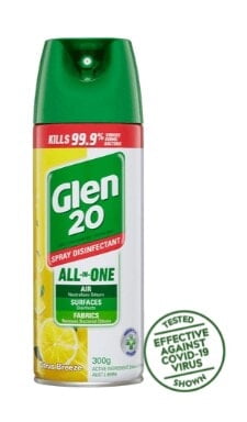Glen 20 Spray Disinfectant can help protect your family by working to prevent the spread of germs. Glen 20 is fast, easy to use and effective at: Killing 99.9% of germs/bacteria* and viruses^ on hard and soft surfaces. Killing the source of mould allergens and controlling the growth of mould and mildew on hard surfaces. Eliminating odour causing bacteria to leave your home smelling fresh and clean. Glen 20 """"gets to the source"""" of the odour without heavy perfume and eliminates damp musty odours in areas where air does not circulate. Ordinary non-germicidal sprays can't do this.