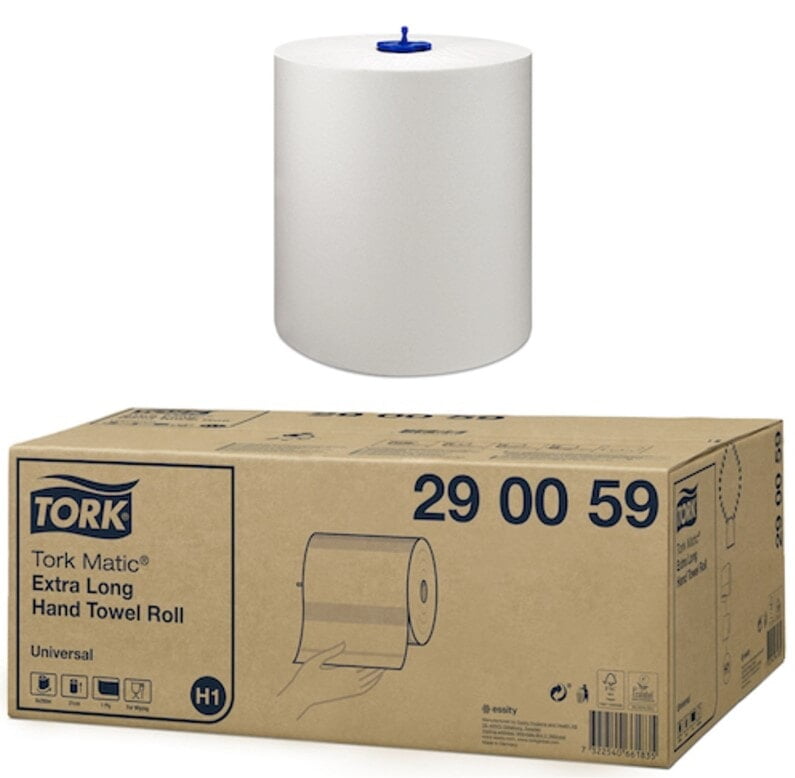 Tork Matic Extra Long Hand Towel Roll H1 System 6 Rolls (290059) | Tork Products Tork Matic extra long hand towel roll provides a high capacity that is ideal for busy washrooms found in places like schools and airports The rolls are suitable for the Tork Matic Hand Towel Roll Dispenser, developed for easy maintenance in high traffic washrooms Easy to open, easy to flatten and easy to carry away System H1 - Hand towel roll system Quantity: 6 Rolls of 280mtr
