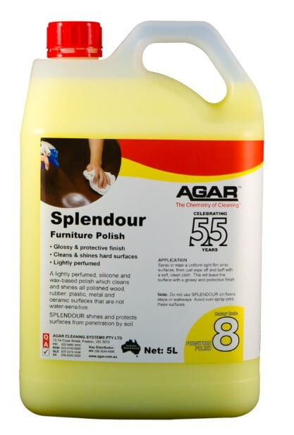 What is Splendour? SPLENDOUR is a lightly perfumed, silicone and wax-based polish which cleans and shines all polished wood, rubber, plastic, metal and ceramic surfaces that are not water-sensitive. How Does It Work? SPLENDOUR is a lightly perfumed, silicone and wax-based furniture polish which waxes, cleans and polishes in one easy spray-wipe application.