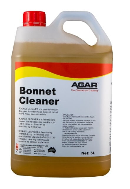 What is Bonnet Cleaner? BONNET CLEANER is a premium liquid detergent for cleaning all types of carpet by the rotary bonnet method. It is a fast-reacting cleaner that releases soil quickly from carpet fibres so that they can be absorbed by the bonnet. How Does It Work? BONNET CLEANER is free-rinsing to leave minimal residues on the carpet, and it is fast-drying to enable commercial carpets to return to service soon after being cleaned (usually within one hour). BONNET CLEANER complies with Australian/New Zealand Standard AS/NZS 3733 for carpet cleaning systems. Bonnet cleaning is best suited for lightly to moderately soiled carpets. Heavily soiled areas should be hot-water extracted to ensure complete removal of soilage.