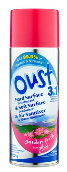 About Oust™ 3 in 1 Garden Fresh - Hard Surface Disinfectant, Soft Surface Deodoriser and Fights Tough Odours 325G Oust™ 3 in 1 is a hard surface disinfectant, soft surface deodoriser and fights tough odours. With hospital-grade disinfectant properties, Oust™ kills 99.9% of Germs*, Viruses** and Fungi*** on hard surfaces, whilst reducing odours. Oust™ 3 in 1, Hospital grade disinfectant, Garden Fresh is listed in the ARTG, AUST L 145645. BENEFITS Kills 99.9% of Germs* and Viruses** Reduces odours Surface spray disinfectant – hospital grade Garden Fresh fragrance by Glade DIRECTIONS TO REDUCE ODOURS IN THE AIR: Shake can well. Point can towards centre of the room and spray. TO DISINFECT: Spray pre-cleaned surface until wet. Allow to stand for 10 minutes. Not intended to be used on medical devices. TO DEODORISE: Spray on surfaces as needed. Test a small area that cannot be seen for colour fastness first. Keep children and pets off treated surfaces until dry. Do not use on bedding, mattresses, clothing, leather or silk, polished wood, painted surfaces, or acrylic plastics. DO NOT SPRAY ON PETS. MADE IN AUSTRALIA Product Details: OUST - GARDEN FRESH Pack Size: 325G/ 6 per Carton SCJP AU Product Code: 618852 SCJP NZ Product Code: 618884 GTIN14 Case Code: 19300622705887 GTIN13 Unit Code: 9300622644387 Carton Specifications: W 140 mm x D 205 mm x H 213 mm Carton Weight: 2.73 kg
