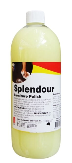 What is Splendour? SPLENDOUR is a lightly perfumed, silicone and wax-based polish which cleans and shines all polished wood, rubber, plastic, metal and ceramic surfaces that are not water-sensitive. How Does It Work? SPLENDOUR is a lightly perfumed, silicone and wax-based furniture polish which waxes, cleans and polishes in one easy spray-wipe application.