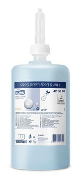 Tork 420601 Hair and Body Liquid Soap S1 Light Blue 1000ml - Carton of 6 Tork Hair and Body Liquid Soap gives hotels, schools and sports facilities the convenience of a shower gel and shampoo in one efficient unit. It has a mild formula with a refreshing, unisex fragrance that leaves skin and hair feeling soft. Suitable for Tork Liquid Soap Dispensers. A 2-in-1 formula contains caring and mild ingredients Quick and easy refilling proven with easy-to-use certification by the Swedish Rheumatism Association Sealed bottle with single-use pump secures good hygiene and reduces risk of cross-contamination PRODUCT DATA System: S1 - Liquid soap system Appearance: Pearling Agent Fragrance: Fresh Unisex Scent Volume: 1000 ml No of doses: ≈1000 Colour: Light Blue COMPATIBLE WITH THE FOLLOWING DISPENSERS Tork 560000 Liquid Soap Dispenser S1 White Tork 560008 Liquid Soap Dispenser S1 Black Tork 560100 Liquid Soap Dispenser Arm Lever S1 White