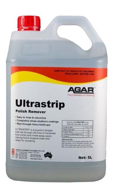 What is Ultrastrip? ULTRASTRIP is a powerful stripper that rips through old films of hardened floor polish and rinses away easily leaving old floors stripped clean and ready for recoating. Key Benefits Odourless Easy to rinse Complete stripping action, even on stubborn coatings Rips through old polish and heavy build-ups Floors are not slippery to walk on when ULTRASTRIP is in use