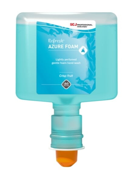 About Refresh™ AZURE FOAM Features & Benefits Good Environmental Choice Australia Certified Product - This product has been independently certified as meeting the requirements of Good Environmental Choice Australia PCPv4.1i-2013 Personal Care Products Standard. See www.geca.eco. Signature Fragrance - A ‘Crisp Fruit’ fragrance with caring, pleasantly fresh and clean notes to elevate the restroom experience for every day use. Proven to have broad appeal amongst washroom users. Mild Formulation - Dermatologist tested to verify and confirm this product does not elicit dermal irritation. Mild Preservative - Specially formulated with one of the mildest preservatives to reduce the risk of skin irritation from using this product. Contains Glycerin - A skin moisturiser to help prevent drying and leave the skin feeling smooth after use. Formulated with a low pH value (5.5 – 6.5) - Formulated to maintain the skin’s acid mantle; a layer on the surface of the skin which acts to help support the natural bacteria balance. Washes away over 99% of dirt and germs - Just a single pump is required to deliver highly effective skin cleansing when used properly. Readily Biodegradable - The formula and each of its carbon containing ingredients will decompose into simple, non-toxic substances in 28 days or less in accordance with OECD301F standard. High quality smooth foam - Pleasant silky-smooth skin feel when washing; helps reinforce good hand washing practice. Convenient, quick and easy - Dispenses foam on the hands which is instantly ready for washing and quick & easy rinsing from hands and sinks. Excellent cost in use - Highly economical, only one dose is required to provide effective hand cleansing. Provides over 30% more washes and uses 36% less product compared to lotion soap. Reduces water consumption - Can save up to 45% on water consumption compared to lotion soaps.