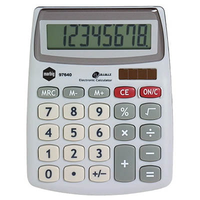 Marbig desk top calculator is solar powered with the added security of battery back-up for low light conditions Ideal for everyday calculations Extra large and tilted 8 digit display for easy viewing Slim and compact design for convenience of storing Quickly and neatly sits in desk drawers when not in use Solar powered with the added security of battery back up for low light conditions Features include 3 key full memory function, percentage and square root keys