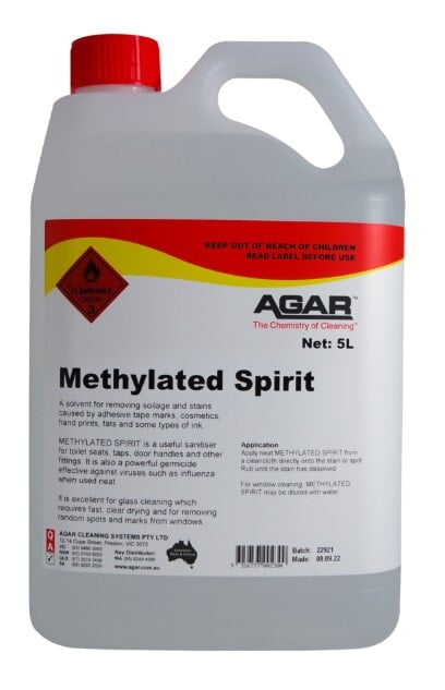 What is Methylated Spirit? A solvent for removing soilage and stains caused by adhesive tape marks, cosmetics, hand prints, fats and some types of ink. It is also a powerful germicide. How Does It Work? METHYLATED SPIRIT is suitable for removing adhesive tape marks, cosmetics, touch marks, fats and some types of ink stains from hard surfaces. It is particularly useful for removing random spots and marks from windows. METHYLATED SPIRIT also kills many germs and is therefore a useful sanitiser for toilet seats and other fittings.
