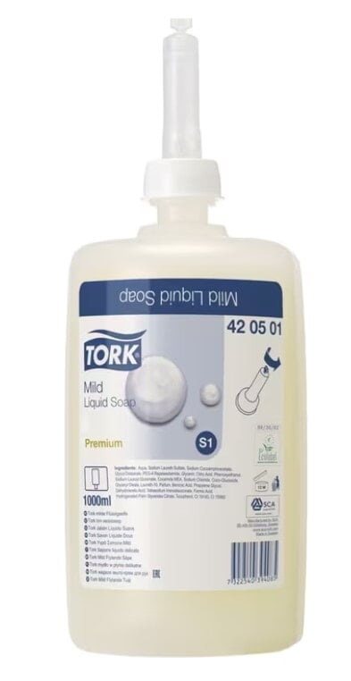 This Tork S1 Premium Mild Liquid Soap is great for washing your hands after kitchen or bathroom use. It has a mild formulation that's skin friendly and leaves the skin feeling soft and conditioned. There is 1 L of soap in this refill canister. It's great for using in your kitchen or bathroom. It has a conditioning formulation to leave your skin feeling soft. It is compatible for use with Tork S1 Dispensers, which can be found using the product code SC560000.