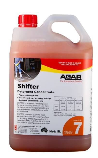 What is Shifter? SHIFTER is a powerful cleaning agent for use in removing stubborn soils from hard surfaces. It also prevents the soils from re-depositing. How Does It Work? SHIFTER is a concentrated alkaline hard surface cleaner designed specifically to remove soil from ceramic tiles, concrete floors, walls and paintwork. It is a sophisticated blend of ingredients intended primarily for use in auto scrubbers, and also for mopping by hand. This concentrated detergent: Powers through dirt – even dirt trapped in pores Dissolves and carries away the soil For Use On… SHIFTER will remove all soil and spillages including foodstuffs, drinks, cooking oil, general dirt and road grime from hard, unsealed floors, walls and paintwork. SHIFTER is ideal for extracting soil from troublesome porous floors particularly hard-to-clean ceramic tiles and quarry tiles. It may also be used on concrete, bluestone, slate and terracotta. SHIFTER is designed for use in autoscrubbers, although it may also be used for mopping, scrubbing with single brush rotary machines and pressure washing.