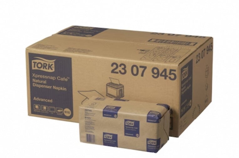 Tork Universal Xpressnap Café Natural Napkins N10 6000/case (2307945) | Tork Products DX606E Universal Natural Napkins N10 System DX606E Universal Natural Napkins N10 System is the ideal solution for limited service restaurants where a small napkin is preferred. The compact dispenser delivers napkins one-at-a-time, improving hygiene and reducing consumption by up to 25%, when compared to traditional dispenser napkins. Colour: Natural Quantity: 6000 per case, 12 packs of 500 napkins Layers: 1 Ply Unfolded Width: 21.6 cm Unfolded Length: 21.6 cm