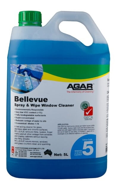Bellevue What is Bellevue? BELLEVUE is a glass cleaner that rapidly penetrates and removes light to medium soil loads from windows and mirrors. It is a water-based detergent that has been formulated to produce the lowest possible impacts on both people and the environment, whilst facilitating highly effective and productive cleaning. Key Benefits Hypo-allergenic* and promotes good indoor air quality. Safe to use and colour-coded for easy identification. Attacks dirt fast Evaporates quickly, so less wiping is required Non-streaking Not classified as Dangerous Goods Sparkling glass and mirrors result when this product is use