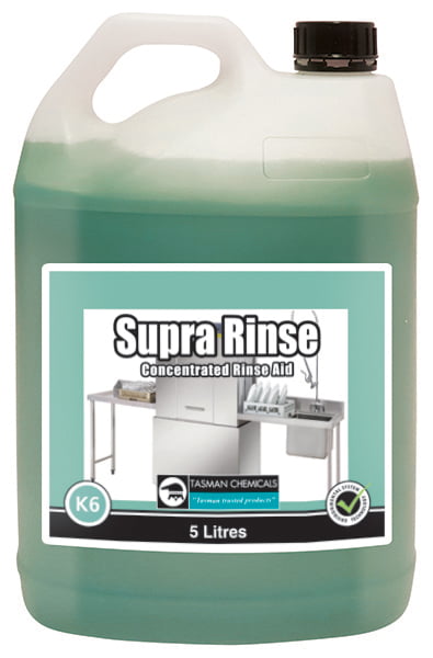 SUPRA RINSE is a drying agent which when added to the final rinse water of glass or dish washing machines, by means of a specially designed feeder, dramatically reduces drying time of washed articles. SUPRA RINSE also markedly improves the finished appearance of crockery, glassware and cutlery by eliminating water spotting. . SUPRA RINSE is a pink moderately viscous liquid and contains ingredients which, when mixed with water at 60- 90°C rapidly lowers the surface tension of water and prevents water from forming droplets on a surface. This product is equally effective in both soft and hard water as it contains a water softener and antiscaling agents. SUPRA RINSE eliminates the need for manual toweling of washed articles, thus reducing the possibility of spreading pathogenic organisms due to this method of drying. SUPRA RINSE is safe on all metals normally found in the construction of dish washing and glass washing machines. . BENEFITS . ♦ Effective in hard or soft water. ♦ Eliminates spotting and streaking. ♦ Safe on metals and plastic-ware. ♦ Economical to use. ♦ Contains an antiscaling agent. ♦ Colour coded for safety and identification.