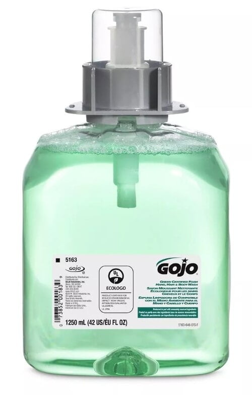 GOJO® 5163-04 FMX™ Green Certified Foam Hand, Hair & Body Wash 4x1250ml Foam hand wash & body wash and hair shampoo. Spa-quality formulation with a cucumber melon fragrance. 1250ml Refill for GOJO® FMX-12™ Dispenser – GOJO5150. Size: 1250ml Qty: Carton of 4 Pods