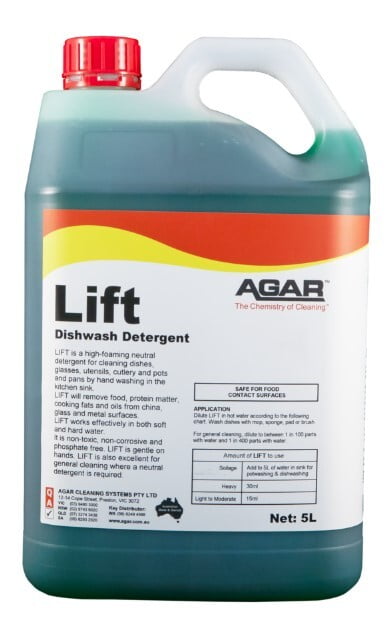 Lift What is Lift? LIFT is a high-foaming, neutral detergent for cleaning dishes, glasses, utensils, cutlery and pots and pans by hand washing in the kitchen sink. LIFT will remove food, grease, protein matter, cooking fats and oils from china, glass and metal surfaces. Its excellent capacity for removing fats and food residues makes LIFT an ideal pot-wash detergent. LIFT works effectively in soft and hard water. LIFT is also excellent for general cleaning where a neutral detergent is required. Main Benefits Suspends food residues and rips through fatty films. Is gentle on the hands – can’t be beaten for dishwashing. Is economical to use. Has a non-residual fresh lemon perfume.