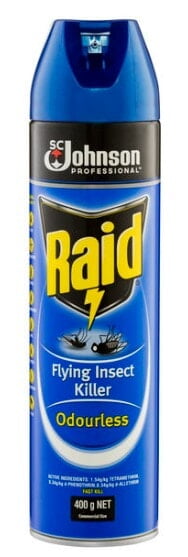 Raid® Flying Insect Killer Odourless is a specially designed formula that: Provides fast kill of flies, mosquitoes, moths and fleas when sprayed directly onto the insect. Leaves virtually no smell. Raid Flying Insect Killer Odourless will also provide an effective kill on crawling insects such as cockroaches, ants, silverfish and spiders.