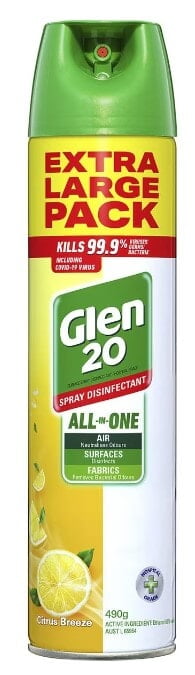 Glen 20 Spray Disinfectant All-In-One Original is a surface spray disinfectant that is proven to kill 99.9% of germsbacteria* and viruses^ including Covid-19 virus. Help protect your family by preventing the spread of germs. This product kills the source of mould allergens and controls the growth of mould and mildew on hard surface, kills Athlete’s Foot Fungus on soft surface and eliminates odour causing bacteria, leaving your home smelling fresh and clean. Glen 20 “gets to the source” of the odour without heavy perfume and eliminates damp musty odours in areas where air does not circulate.