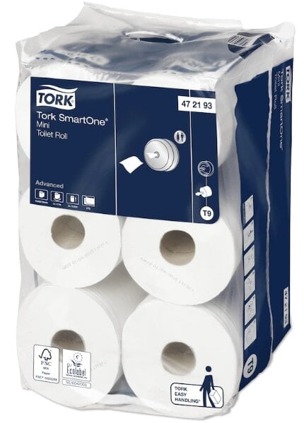 The Tork SmartOne Mini Toilet Roll System uniquely delivers one hygienic sheet at a time, helping to reduce consumption by up to 40% compared to traditional jumbo roll dispensers, which means more visits per roll. Tork SmartOne Mini high-capacity rolls are suitable for demanding washrooms from low to medium to high traffic, depending on which Tork SmartOne Mini dispenser is chosen. Quick disintegration and reduced consumption; minimizes risk of pipe blockages SmartCore® - for fast and easy core removal when refilling High capacity: less maintenance and reduced risk of paper shortage Soft tissue with high brightness for a lasting impression Roll length 111.6 m Roll width 13.4 cm Roll diameter 14.9 cm Number of sheets 620 Sheet length 18 cm Core inner diameter 4.4 cm Ply 2