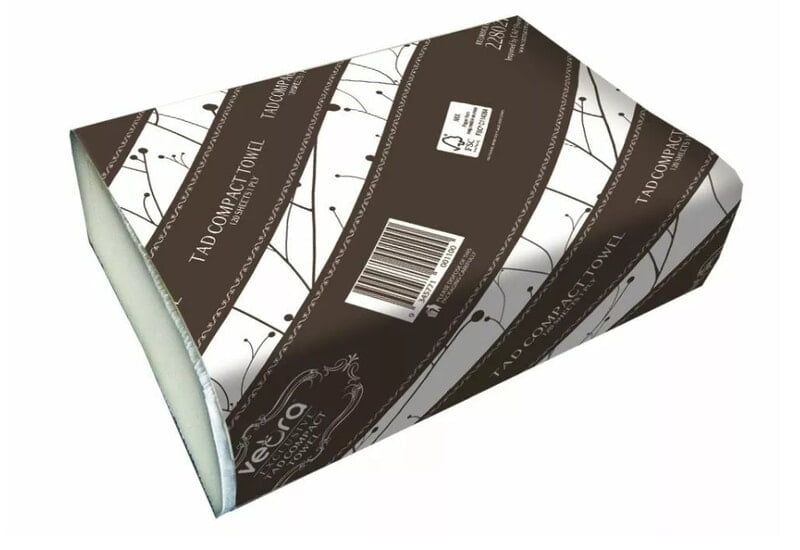 Exclusive TAD Compact Towel 1 Ply. 18 packs x 120 sheets. Sheet size 190 mm x 250 mm. Ideal for small bathrooms where space is a factor to be considered.